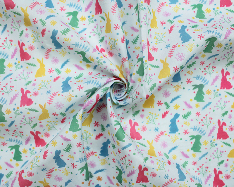 A cute polycotton fabric featuring adorable digital bunny prints, perfect for children's clothing, accessories, and craft projects.